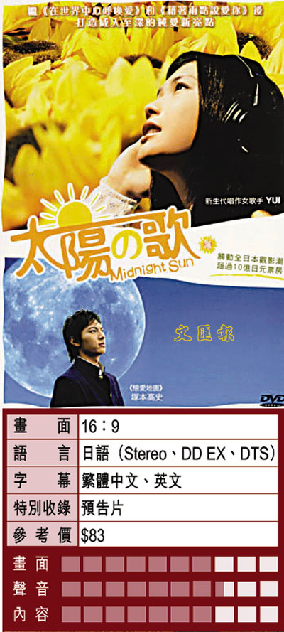 佩服日本人,同一個題材,可以有不同媒介的作品誕生,而且都取得好成績。最矚目的,當然是已經說濫了的《電車男》,後來還有《海猿》、《一公升眼淚》等。這次要介紹的影碟《太陽之歌》也一樣——據說,由澤尻龍英華主演的電視版更加賺人熱淚,記者沒有看過電視版,由新生代唱作歌手YUI主演的電影版,卻也不差。