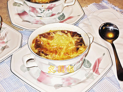 ■把上述洋蔥湯放入焗爐內焗約十分鐘,至芝士變金黃色,便可取出食用。