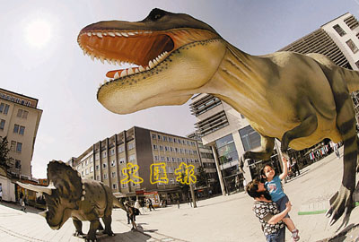 ■市民無懼翻生恐龍橫行鬧市,小孩更忍不住要跟暴龍握手,皆因那都是來自德國哈根恐龍主題公園裡的十三件仿真恐龍展品。