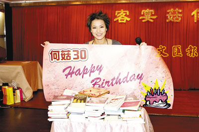 【本報訊】(記者 梁靜儀)五月十日生日的何韻詩,為慶祝踏入三十歲的大日子,前晚壽星女自掏腰包拿出六位數,筵開三十席舉行「何菇三十壽宴」,與歌迷齊提早慶祝生日。同時她更將Fans原本用來買禮物的三萬元捐給「樂施會」做善事,寓慶祝於行善。