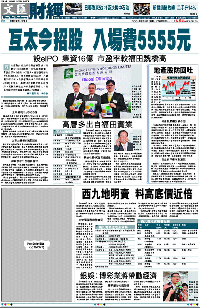 截至3月底互太預測全年盈利不少於5.52億元,按年升20%,每股盈利預計不少於0.39元,預測市盈率10.6至14.1倍。以市盈率比較,互太較福田實業(0420)及魏橋紡織(2698)的7.53倍和10.49倍貴。按發售價最高5.5元計,互太上市後市值為78.8億元,較福田的23.11億元,以及魏橋的62.1億元為高。