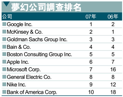 Google現在是互聯網搜尋市場的霸主,也是增長最快的科技公司之一。去年Google的員工數成長近一倍,公司提供眾多羨煞人的福利。去年Google在此調查排第2,前年更才只是第129名。Google的最大對手雅虎今年排22。蘋果電腦排第6,微軟第7。