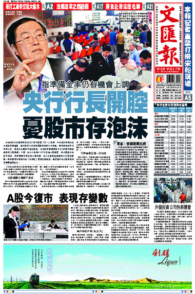 內地A股9,000萬股民在忐忑不安中度過「五一」長假,中央並未在節內出台新的宏調措施,這令節前大多持股過節的股民心中欣喜,眼見周邊股市均表現上佳、香港及台灣股市創出新高,內地股民普遍認為今日A股開市將延續節前上漲勢頭。不過,央行行長周小川7日在瑞士再開腔,表示憂慮內地股市泡沫,存款準備金率仍有上調空間,央行正監控資產價格以及通貨膨脹。周的講話令整個內地「金魚缸」變得迷離難測,專家指中央必將有新的宏調舉措再出台。