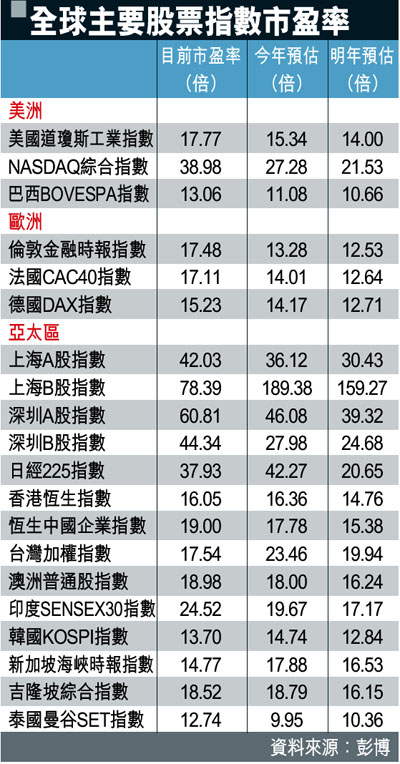 全球主要股票指數市盈率 (圖)