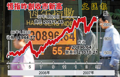 美股連續4日創收市新高,亞太區股市全面造好,港股昨日高開92點後,即升破今年1月時創下20971點高位,再衝21000點關創21070點歷史新高,最多漲229點。惟午後期指及衍生工具等於高位沽貨,獲利回吐壓力增,大市於創新高後回順,全日僅升55點,收20896點,但仍創收市新高。港股總市值漲至14.6652萬億元,亦創出新高,而主板加創業板合計總成交至687億元,為歷史第7高。