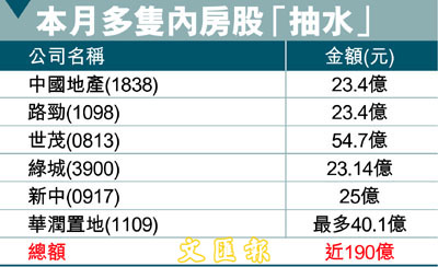 【本報訊】(記者 何麗琪)港股創新高,內地房產股也顯著造好,吸引多家公司趁市旺在市場以各種形式「抽水」,繼綠城中國(3900),世茂房地產(0813)及新世界中國(0917)等,分別以配股及發行可換股債券(CB)形式集資後,華潤置地(1109)昨日停牌,市傳其加入「抽水」行列,配售多達4億股,集資近40.1億元。本月內至少有6隻內房股抽水,涉及金額近190億元。