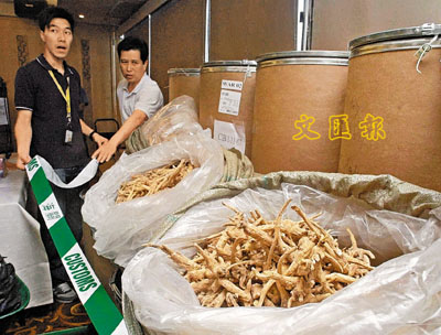■香港海關展示於行動中緝獲的走私花旗參等貨品。