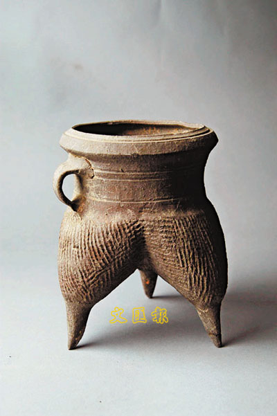 斝:賈(粵)﹔jia (普),斝為酒器。這斝為夾砂灰陶,子口內斂,束腰,乳狀三足,足尖為實錐狀,腰側有一豎狀半圓形環,頸部有三周陰弦紋,乳足上飾印有繩紋。這斝與同時期商代青銅斝相類似。