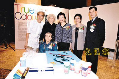 ■廖東梅(前)與父母及主禮嘉賓(右起)信和集團聯席董事楊光、東華三院賽馬會復康中心院長簡佩霞、民政事務局常任秘書長林鄭月娥合照。