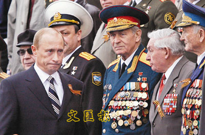 俄羅斯昨日在首都莫斯科紅場舉行閱兵式,慶祝衛國戰爭勝利62周年。總統普京講話稱俄羅斯不會忘記二戰英雄,並對承擔了戰爭責任的那一代人表示深切感謝。他還強調,誰褻瀆二戰英雄紀念碑,誰就是在國家之間製造新的不信任。圖為他講話前經過一群胸前掛滿勛章的二戰老兵。 美聯社