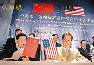 【本報訊】據中新社9日電:中美項目簽約儀式暨中美高科技合作論壇今日在舊金山舉行。中國貿易投資合作促進團與美方在信息通訊產業簽署了26個採購合同和1個投資協定,總價值43.2億美元(約合333億人民幣)。此後,貿促團還將前往亞特蘭大、芝加哥和華盛頓等地,與美方談判多項總值超過160億美元(約合1,231億人民幣)的合作協議。分析認為,合作協議的簽署對吳儀副總理即將展開的訪美有鋪墊作用。