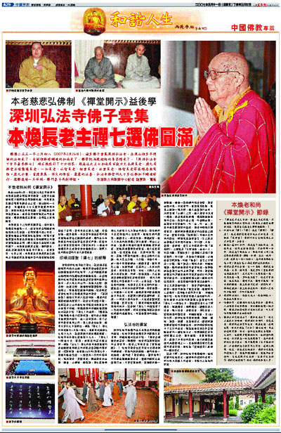 佛曆二五五一年二月初八(2007年3月26日),諸多佛子雲集深圳弘法寺,在深山裡多年閉關的法師來了,古剎裡禪修精進的和尚來了,佛學院滿腹經綸的專家僧來了,「深圳弘法寺丁亥年春季禪七」 磁石般吸引了十方信眾,因為這次主七和尚是百歲方丈本煥長老,座元是禪堂名宿慧通長老,一如長老、正智長老、紹雲長老、白雲長老、悟智長老等高僧悉數駕臨。座元示範,首座聚集,頂尖的陣容,濃濃的法喜,弘法寺禪堂內九十多位禪和子精進修行,選佛道場一片祥瑞,佛門泰斗再創輝煌。