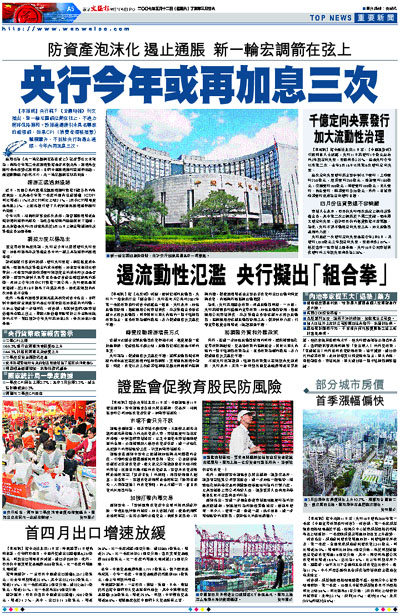 【本報訊】央行轄下《金融時報》刊文指出,新一輪宏觀調控箭在弦上,不過力度將保持溫和。該報道還援引未具名專家的話強調,如果CPI(消費者價格指數)繼續攀升,不排除央行為遏止通脹,今年內再加息三次。