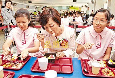 ■廖秀冬昨於香港仔聖伯多祿天主教小學主持「環保午膳」宣傳片啟播儀式,並與學生共進悉心準備的環保午餐,宣揚環保訊息。