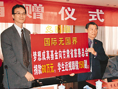黃桂榮代表香港國際無國界基金會將60萬元善款透過甘肅省慈善總會捐給甘肅貧困地區,其中40萬元用在武威市涼州區槐樹鄉松樹村修建一所「夢想成真基金慈善學校」,20萬元用在定西市安定區魯家溝村為500個困難村民修建集雨水窖500眼,同時捐出價值6萬元配備150副眼鏡為患眼病的150名品學兼優學生醫治眼疾。