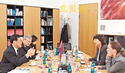 ■周一嶽(左)在柏林與德國聯邦衛生部長施密特(右二)會談,了解當地醫療制度。