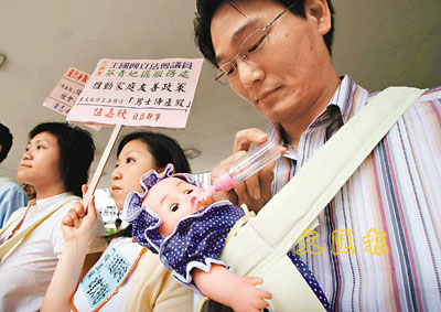 ■遊行人士背著道具嬰兒,促當局制訂男士侍產假。本報記者潘政祁 攝