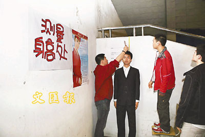■深航此次招生完全按照招收正式空乘的標準進行,例如女生身高須在165至172公分,男生則為175至185公分。圖為考官正在測量報讀學生的身高。本報深圳傳真