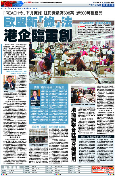 繼WEEE、ROHS、EUP三大環保指令相繼實施後,歐盟《關於化學品註冊、評估、授權和限制制度》(簡稱「REACH法規」)將於2007年6月在歐盟全面開始實施,涉及化學原料及製品、化纖、橡膠、塑料、紡織、輕工、電子、汽車、家電、製藥、塗料等近500萬種由化學物質製成或添加了化學物質的配置品和製成品。而由於相關產品的註冊檢驗費用高達8.5萬至57.5萬歐元(約90萬港元至608萬港元),令東莞、中山等珠三角地區的數千港企產品出口成本陡增,面臨「致命」挑戰。