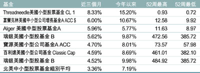 佔近三個月榜首的Threadneedle美國小型股票基金,基金在2004、2005和2006年表現分別為13.07%、8.64%及11.72%,基金平均市盈率和標準差為為22.38倍14.94。