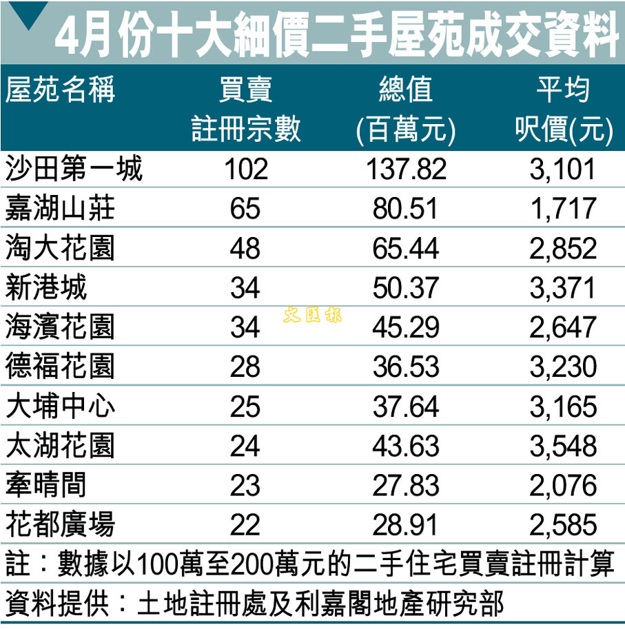 4月份十大細價二手屋苑成交資料 (圖)