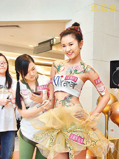 紅色的康乃馨代表母愛偉大。昨日有商場趁著母親節,請來年僅16歲的人體彩繪師上恩美齡,在打扮成鮮花的模特兒身上,畫上一朵朵康乃馨,以代表敬重母親。同時,商場下午亦為在場母親作手部彩繪及編織「花之手鐲」,為佳節送上無限祝福。 ■本報記者李見安 攝