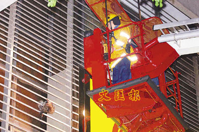 一隻小麻鷹昨傍晚6時許疑與同伴對決時戰敗,在香港仔高空俯衝而下,插入香港仔中心第三期一個離地12米的商場冷氣出風位的空隙,途人見狀報警,警員、消防員、漁護署人員相繼到場,最後由消防員駕起升降台將救下,交愛護動物協會人員帶走急救。本報記者鄺福強 攝