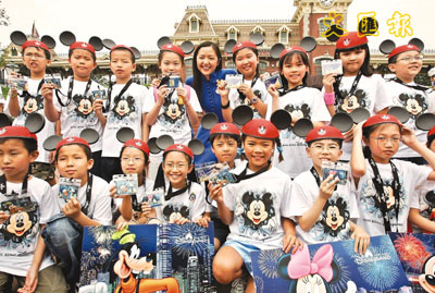 ■香港迪士尼樂園昨安排30名同於97年7月1日出生的小朋友領取全年通行證,慶祝香港回歸十周年。本報記者劉國權 攝