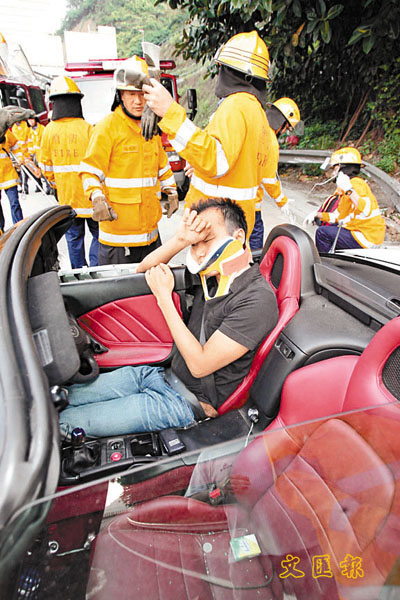 受傷男子姓陳,32歲,頭、手、腳及背均受傷,經送院救治情況嚴重。事發在昨晨6時許,陳駕駛一輛開篷跑車,沿呈祥道向觀塘方向風馳電掣行駛,當駛至大埔道支路入口前一個右轉彎位時,跑車於入彎時突告失控,車身先撞及左邊鐵欄,繼而全車作反方向打轉,右邊車身近司機位車門位置,撼向左路邊一支燈柱,再反彈出路面橫臥路中,司機受傷流血被困在車內,仍然清醒,現場則留下一條5米長煞車痕。