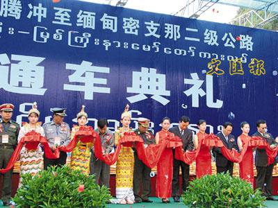 ■4月26日上午,雲南省副省長劉平、緬北軍區副司令桑吞准將等中緬高層為騰密路開通剪綵。