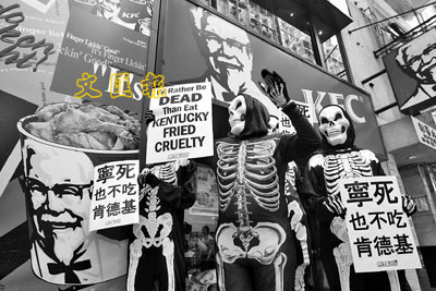 以炸雞聞名的KFC昨日遭到骷髏頭魔「入侵」。一班善待動物組織(PETA)成員昨到肯德基的銅鑼灣分店示威,手持「寧死也不吃肯德基」紙牌抗議,控訴該連鎖店每年殺掉8.5億隻雞。