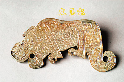 This jade pendant is greenish-grey. The body is flat, carved into the shape of a tiger with its head down, back humped, limbs bent and tail coiled. One side of the body is decorated with a tiger pattern. Some geometrical patterns are on the abdomen and two limbs. The other side is smooth with no decorations. There is one hole each at the mouth and tail for tying purposes.