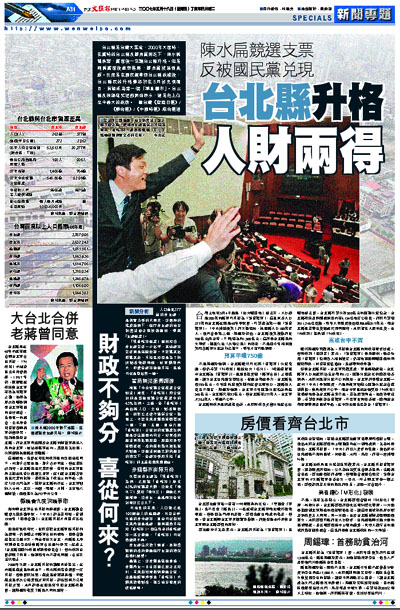 台北縣是台灣大票倉,2000年大選時,在當時的台北縣長蘇貞昌奔走下,陳水扁曾承諾,當選後一定讓台北縣升格。但是阿扁當選後毫無進展,蘇貞昌被罵到臭頭。反而是在國民黨拿回台北縣政權後,台北縣民的升格夢終於在5月初見到眉目,有望成為第一個「準直轄市」。台北縣長周錫瑋笑逐顏開地表示,這是他上任至今最大的政績。