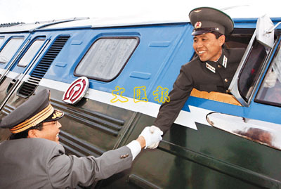 ■韓國列車服務員與朝鮮同行(右)在豬津站熱情握手。 歐新社