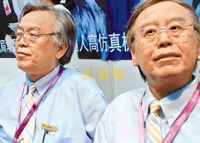 ■別看了,圖片中的兩個人絕對不是雙胞胎。其中一個是西安一家公司研究的高仿真機器人。這個機器人,不單外形逼真,而且會呼吸、能眨眼、可以轉頭、還會說話。發明人鄒人倜原本是一個電影特技師,他說這個機器人雖然技術成份趕不上日本前一段時間推出的仿真機器人,但是在外形仿真上,仍然能夠達到國際頂級水平。他說這個機器人可以接受遠程遙控,即通過攝相頭和MC,將機器人所看到的聽到的,反映到千里之外的真人這邊,而真人這邊的命令或話語也可以通過機器人傳遞出來。「這個好比孫悟空的分身法,專為分身乏術的大忙人設計的。」鄒人倜說。呃……我知道你聽煩了,而且知道你心中仍然存著知道到底哪個是真人哪個是機器人的疑問,但是很不好意思,我也忘記了……(仿真人答案:左邊是真人,右邊是機器人)