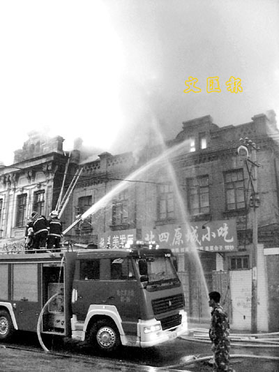 21日,哈爾濱道外區北四道街14號,一老式樓房發生大火。據目擊者介紹,火災發生時,有3人從樓上跳下,跳樓的是一家三口,分別是母親及兩個女兒,後被送往醫院救治。圖為消防員在滅火。中通社