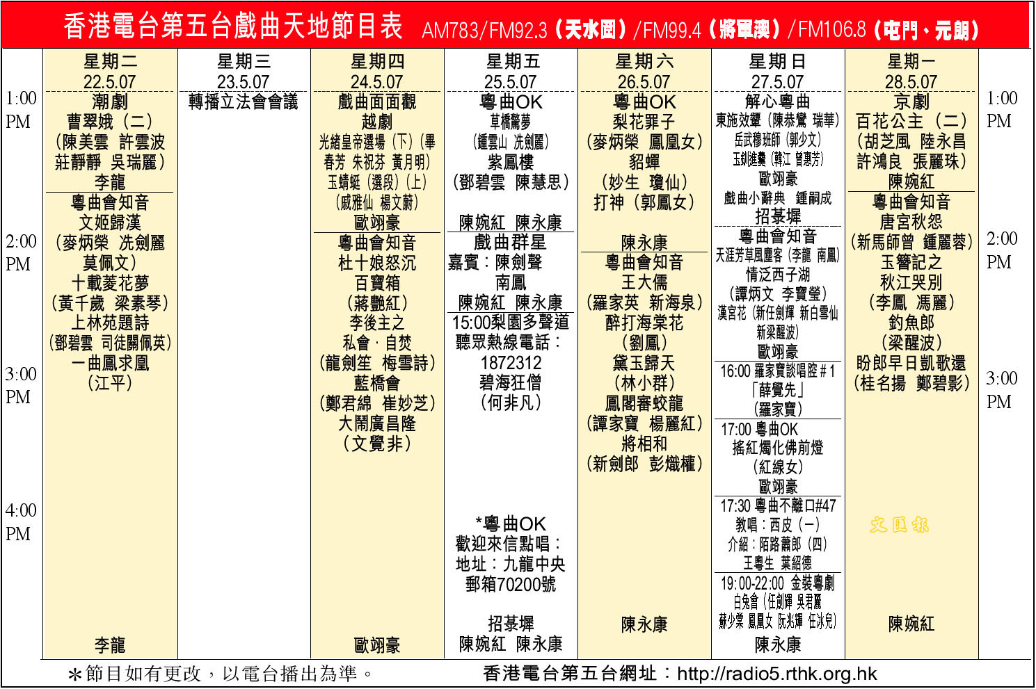 香港電台第五台戲曲天地節目表