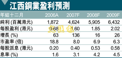 江西銅於A/H差價表中位列前茅,令其成為QDII概念下的得益者。QDII 的股票投資款額僅為180億美元,但其為投資者帶來的心理效益能令未來A/H差價收窄。我們維持「持有」的評級,考慮到由城門山項目帶來的攤薄效應及缺乏短期的利好因素,目標價為12.9港元,反映1.5倍08年預期市帳率。我們對於江西銅的長線表現仍感樂觀,建議投資者於12港元以下增持。