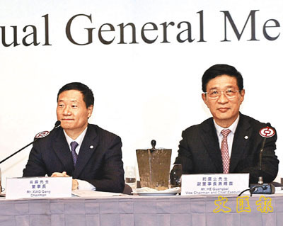 ■肖鋼(左)稱,中行受人民幣升值影響不大。旁為和廣北。本報記者張偉民 攝