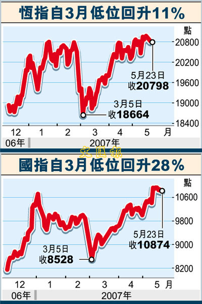 【本報訊】(記者 林德芬)內地股市昨日收市全線下跌,出現高位調整,外圍股市受格老言論影響偏軟,日股昨日收市向下,惟美股昨晚開市走高,早段曾升近百點,料對港股帶來支持。市場人士認為,內地股市在高位調整屬健康現象,臨近下周三期指結算日,大戶可能借機造淡,料港股走勢將反覆波動,期指結算前將反覆向下,料在20,500點至20,700點間徘徊。待期指結算後,下月初港股走勢將明朗化,有機會突破21,088點,有力上試21,500點水平。