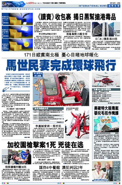 和黃前大班馬世民愛妻詹納弗,與其英籍老拍檔花了5個多月時間,途中克服重重障礙,前日終於返抵美國得州,成功完成駕駛直升機經南北極環繞地球一周的飛行創舉。兩人4年前首度挑戰曾失敗,並且機毀人傷,今番捲土重來終能完成這個「不可能的任務」,的確難能可貴。