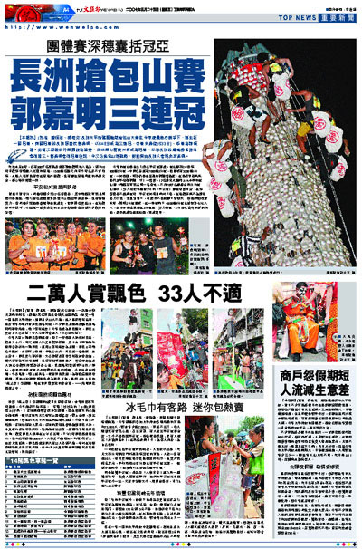 【本報訊】(記者 潘頌禧、郝君兒)長洲太平清醮壓軸戲搶包山大賽在今早凌晨激烈競爭下,誕生新一屆冠軍。兩屆冠軍的長洲原居民郭嘉明,以648分成為三連冠,亞軍朱嘉偉(633分)、季軍為譚頌謙。而首次舉辦的外隊團體邀請賽,深圳隊力壓廣州隊成為冠軍,本港長洲西灣媽勝堂值理會得第三。郭嘉明奪得冠軍後說,今次仿真包山很難爬,對能夠由長洲人奪冠非常高興。