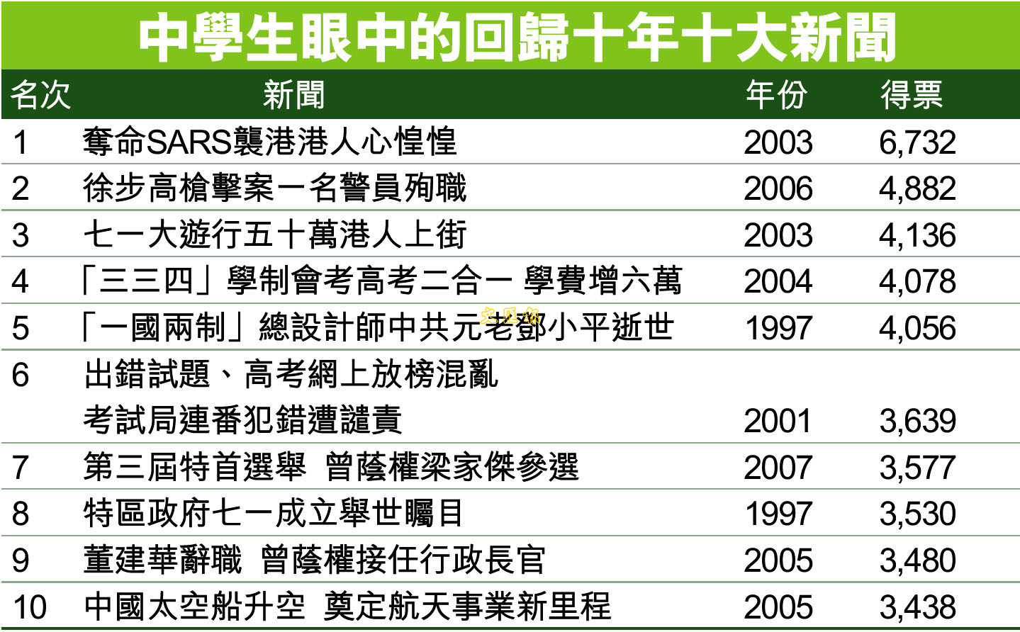 中學生眼中的回歸十年十大新聞 (圖)