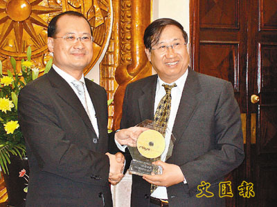 ■越南副總理范家謙(右)接受蔡冠深致送給越南政府的新華LINUX華鐳系統源代碼。