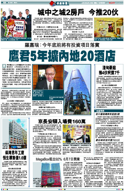 鷹君集團(0041)主席羅嘉瑞昨日在股東會後表示,公司目標在未來5年內,落實20個酒店項目,包括提供管理服務及自己投資發展的項目,目前公司正在內地物色投資項目,以酒店、住宅、商場等綜合發展項目為主,並以公司酒店品牌去推廣,因目前內地很多城市希望興建五星級酒店,而公司旗下三個酒店品牌「朗豪」、「朗廷」及「逸東」在內地已有認受性,故希望可取得較佳地皮作發展,有信心於年底前將有項目可落實。