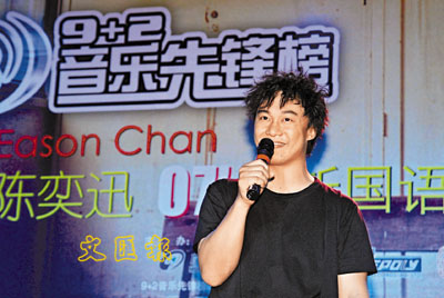 【本報訊】陳奕迅日前出席在廣州舉行的「9+2音樂先鋒榜2007」新聞發佈會,公佈該榜今年的頒獎禮將首次移師香港舉行,並由新城娛樂台承辦,成為首個在香港舉行年度頒獎禮的內地電台排行榜。會上更即場宣佈2007年度第一季選的結果,陳奕迅憑《富士山下》一曲榮登榜首。《富士山下》更蟬聯「9+2音樂先鋒榜」兩周冠軍,而陳奕迅的另一首主打歌《不如不見》連續三星期高居「全球華語歌曲排行榜」第一名,所以大會特別頒發五個「第一」給予陳奕迅,成績可觀。