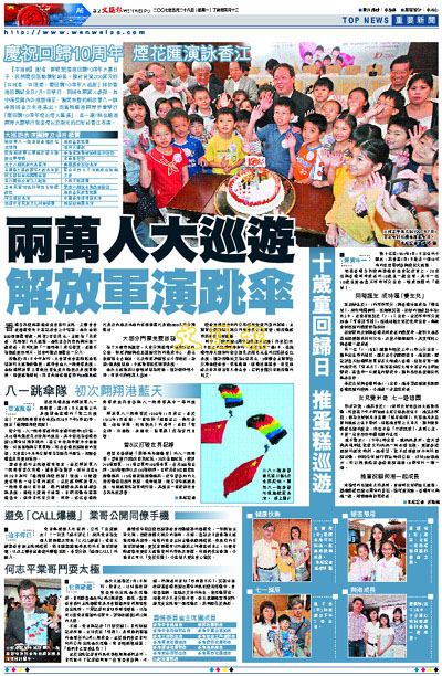 【本報訊】(記者 郭曉樂)香港回歸10周年大喜日子,民間慶祝活動精彩紛呈。預計耗資200萬元的「共成長.共理想,慶回歸10周年大巡遊」將於香港回歸紀念日7月1日舉行,料將有兩萬人參與,其中備受國內外推崇備至、獲獎無數的解放軍八一跳傘隊將首次來港演出。而當晚維港兩岸亦會舉行「慶回歸10周年煙花煙火匯演」,並一連7晚在維港兩岸大廈舉行包含煙花及激光的幻彩詠香江表演。