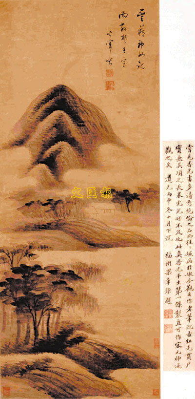 董其昌,字玄宰,號思白、香光居士,華亭(今上海市松江)人。進士出身,官至禮部尚書。山水畫以平淡天真見勝。繪畫注重師法古人,能融會變化,墨色層次豐厚,用筆則以書法入畫。提倡山水畫「南北宗」論,推崇「南宗」為文人畫正派。其畫影響當時畫壇極大,並遠及清初以至近代畫壇。