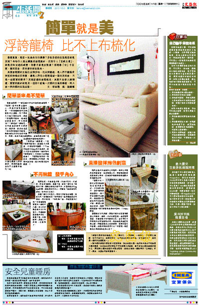 一對年輕的新婚夫婦接受小記訪問時,談及家居心得。他們表示自己不能負擔大屋的屋租,300至400呎的單位不可以放置大件傢俬,倒不如花心思於傢俬的設計上,再花點心機於家居的佈局及配搭,給自己營造一個簡單的「安樂窩」好了。原來,幸福也可簡單得到手。