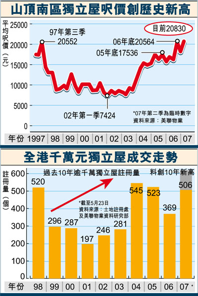 他又指,今年豪宅獨立屋的推盤量亦大幅飆升,豪宅獨立屋的推盤量錄得346伙,較06年僅得75伙,大幅飆升361%,全年獨立屋推盤量亦有機會打破05年400伙的紀錄。成交價方面,傳統豪宅區的獨立屋呎價更屢創新高,目前山頂南區獨立屋平均呎價為20,830元,已創出歷史新高,較05年底的17,536元升19%。